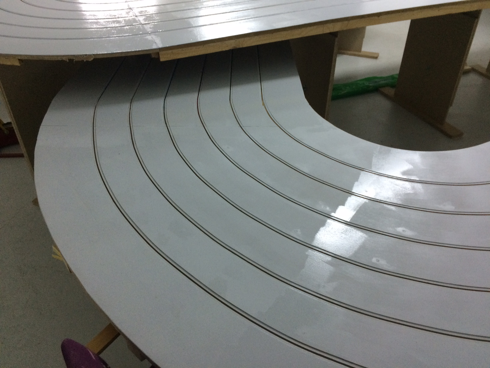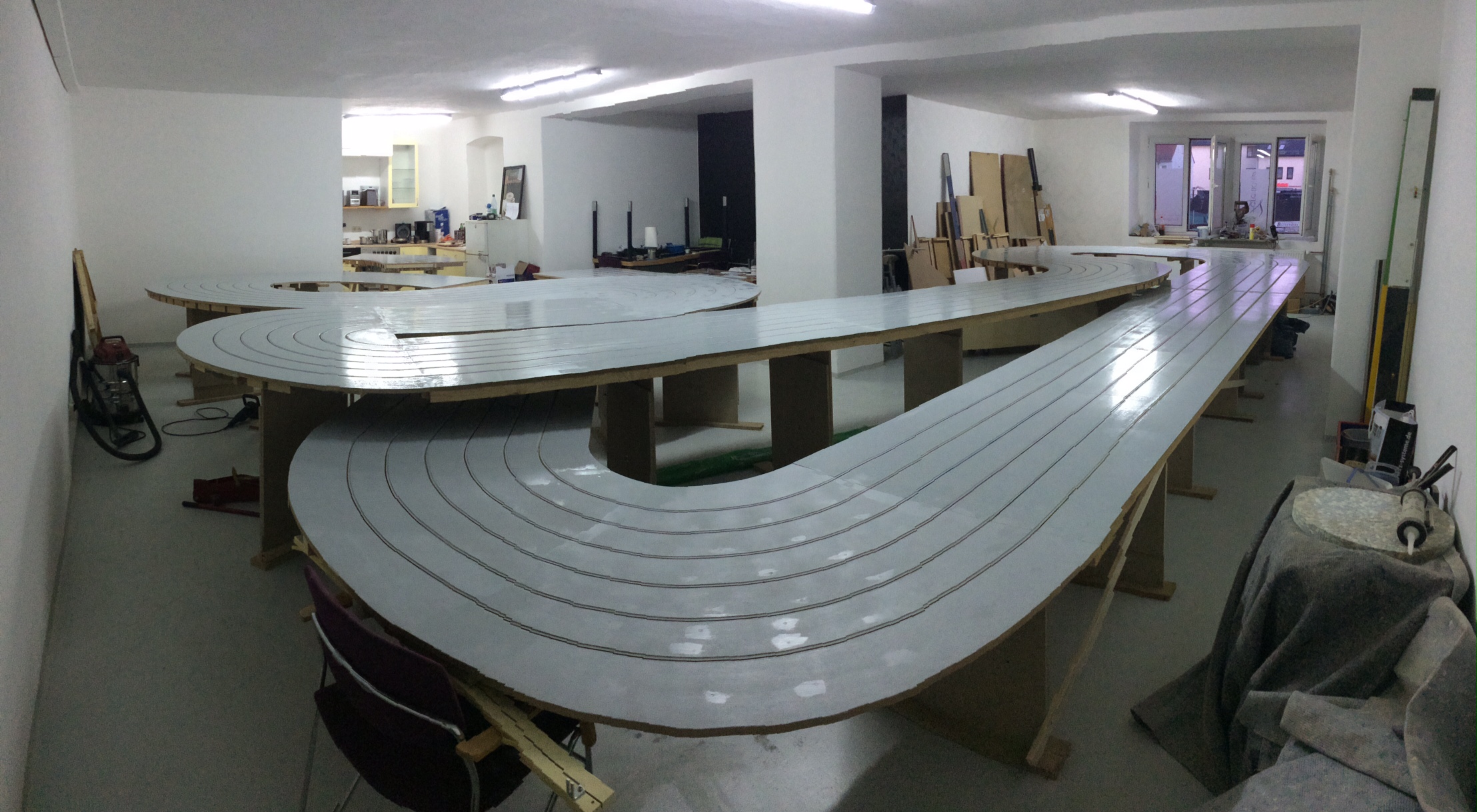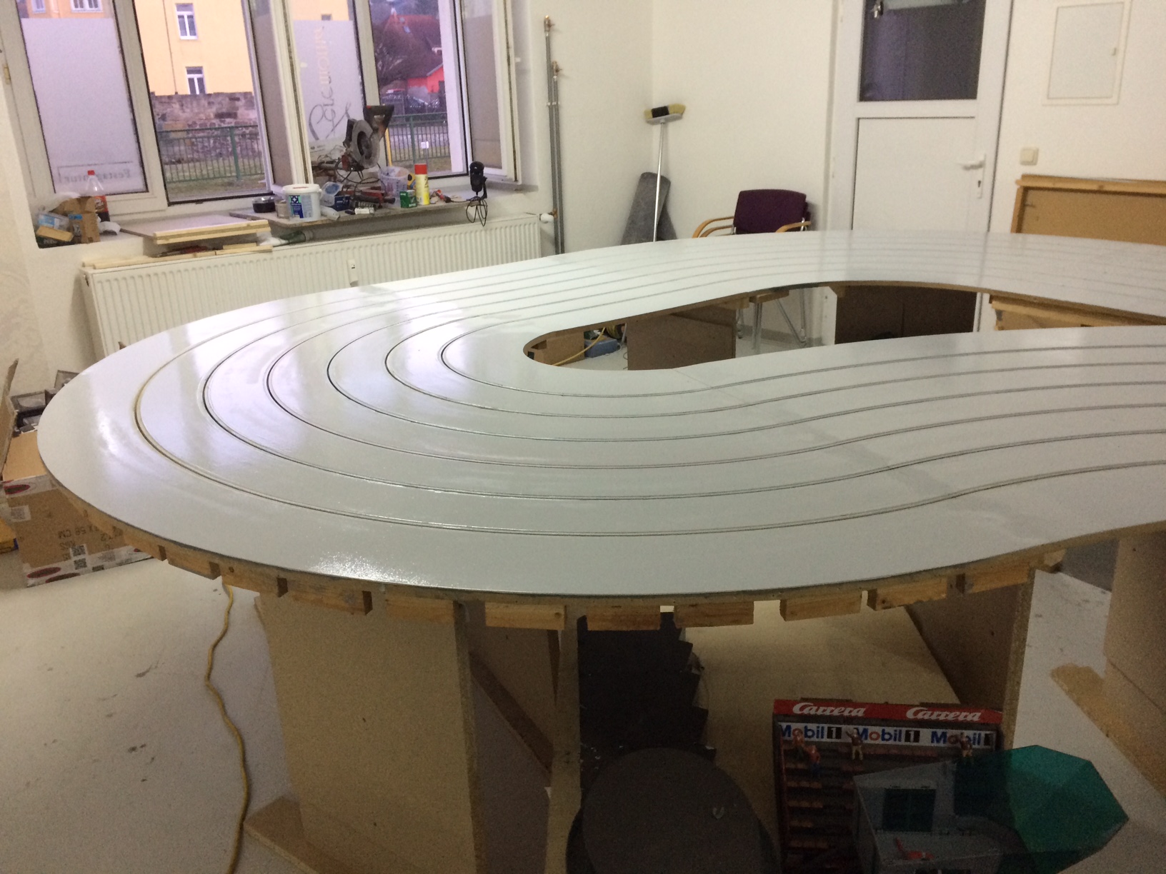 Gegen 18.00 Uhr war es dann soweit. Der Melkusring war fast komplett. Alle Bahnteile waren ausgerichtet und die Höhen angepasst. Es fehlte nur ein kleines Teilstück, welches neu gefräst werden musste. Bevor unser Holzprofi oder besser unser Fräsmeister Steffen mit den Fräsarbeiten beginnen konnte, musste erst einmal die neue MDF Platte angepasst werden, damit sie zwischen die beiden Enden der passte. Wir haben auch noch einmal ein Stückchen Bahn abgeschnitten, um noch etwas mehr Platz für die Rennleitung zu schaffen. Um 20.00 Uhr begann dann Steffen mit den Fräsarbeiten. Spur für Spur wurde fräste er mit ruhiger Hand meisterlich ins MDF. Gegen 21.30 Uhr war er schon mit den Fräsarbeiten fertig. Das ging wirklich schnell, aber ein Profi ist nun mal ein Profi ;-) Jetzt hieß es den Raum noch vom ganzen Säge- und Frässtaub zu befreien. Ca. 1 Stunde wirbelten wir mit dem Industriesauger durch den 100 qm großen Raum. Nachdem auch das fertig war öffneten wir noch ein Feierabend Bier und philosophierten noch etwas über die weiteren Tätigkeiten. Ein Thema war der Parc Fermé. Dafür haben wir uns etwas ganz besonderes einfallen lassen. Aber dazu an andere Stelle mehr, wenn wir es realisiert haben. Lasst Euch einfach überraschen :-)