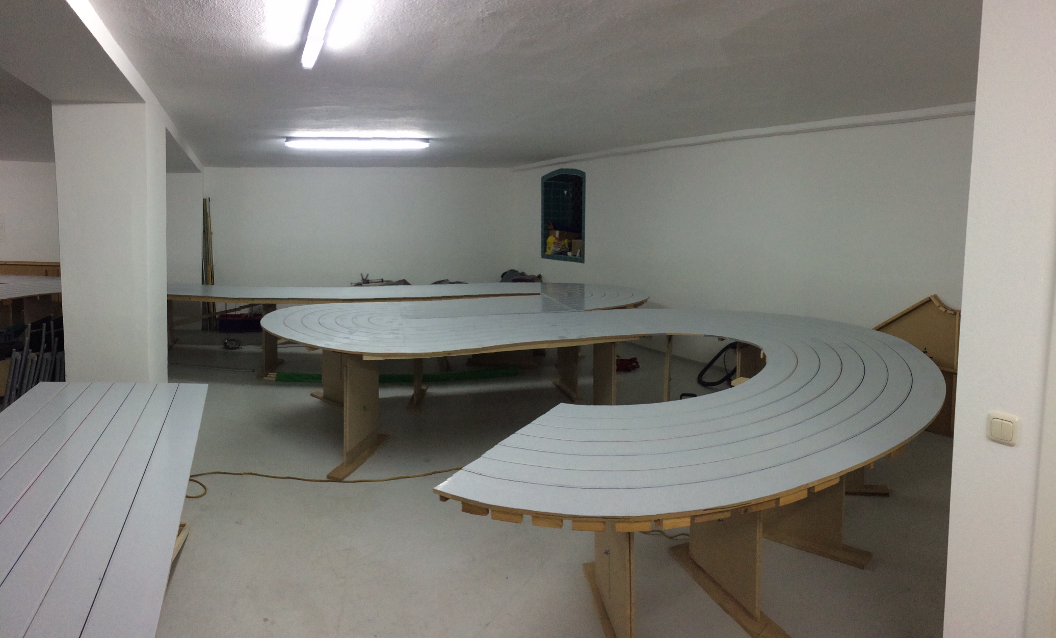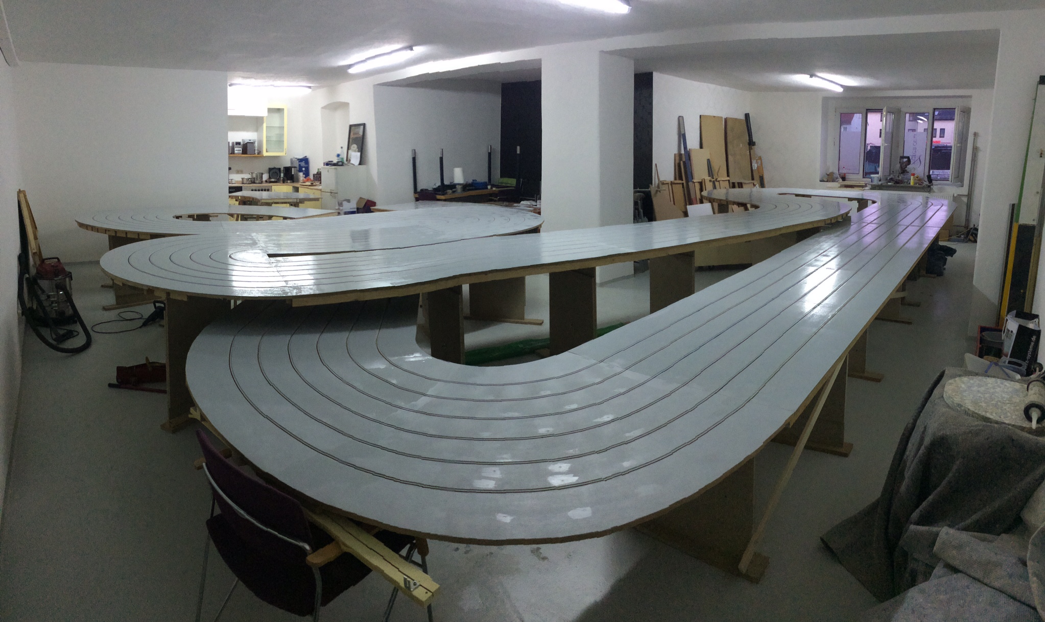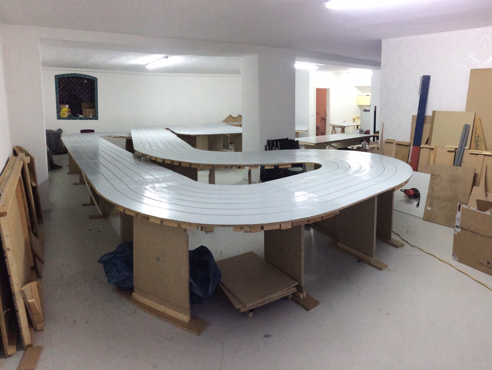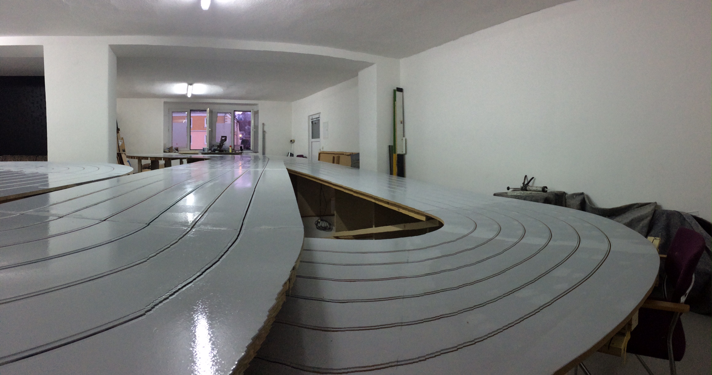 Gegen 18.00 Uhr war es dann soweit. Der Melkusring war fast komplett. Alle Bahnteile waren ausgerichtet und die Höhen angepasst. Es fehlte nur ein kleines Teilstück, welches neu gefräst werden musste. Bevor unser Holzprofi oder besser unser Fräsmeister Steffen mit den Fräsarbeiten beginnen konnte, musste erst einmal die neue MDF Platte angepasst werden, damit sie zwischen die beiden Enden der passte. Wir haben auch noch einmal ein Stückchen Bahn abgeschnitten, um noch etwas mehr Platz für die Rennleitung zu schaffen. Um 20.00 Uhr begann dann Steffen mit den Fräsarbeiten. Spur für Spur wurde fräste er mit ruhiger Hand meisterlich ins MDF. Gegen 21.30 Uhr war er schon mit den Fräsarbeiten fertig. Das ging wirklich schnell, aber ein Profi ist nun mal ein Profi ;-) Jetzt hieß es den Raum noch vom ganzen Säge- und Frässtaub zu befreien. Ca. 1 Stunde wirbelten wir mit dem Industriesauger durch den 100 qm großen Raum. Nachdem auch das fertig war öffneten wir noch ein Feierabend Bier und philosophierten noch etwas über die weiteren Tätigkeiten. Ein Thema war der Parc Fermé. Dafür haben wir uns etwas ganz besonderes einfallen lassen. Aber dazu an andere Stelle mehr, wenn wir es realisiert haben. Lasst Euch einfach überraschen :-)