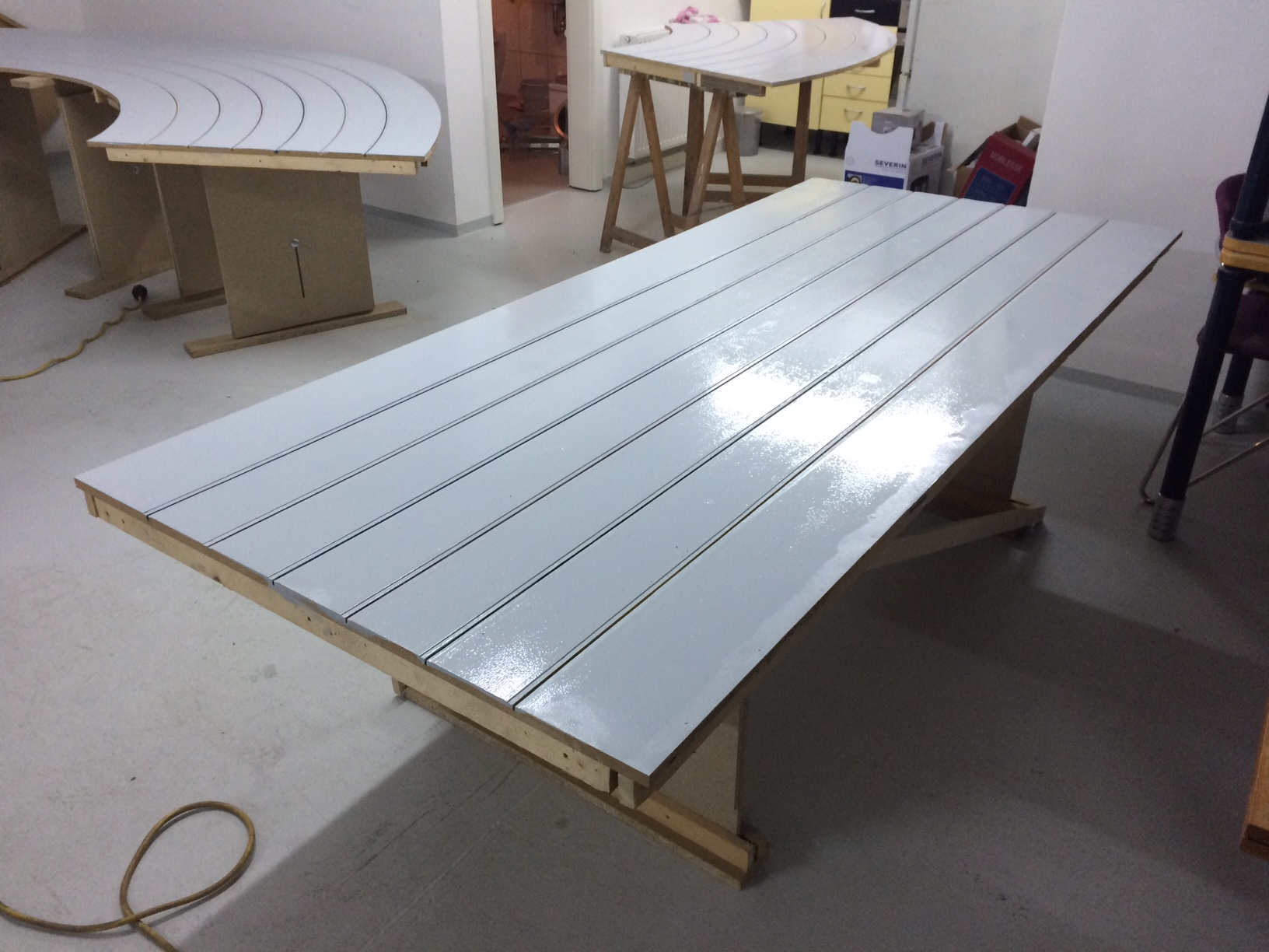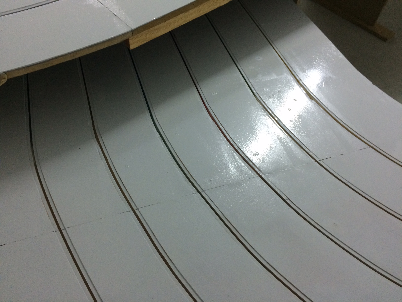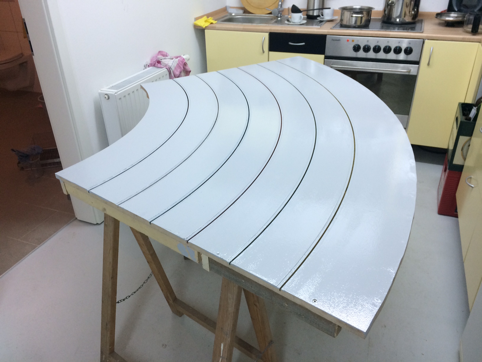 Am Dienstag und Mittwoch haben wir die komplette Bahn noch einmal ausgerichtet, damit alle Stöße schön plan sind. Diese mussten dazu auch noch mal verschliffen und das Litzenbett teilweise noch mal angepasst werden. Weiterhin haben wir dann, auch am Donnerstag, alle Löcher verspachtelt, geschliffen, verspachtelt, geschliffen, verspachtelt, geschliffen und nochmals verspachtelt und geschliffen. Das war wirklich eine so staubige Angelegenheit, dass auch am Donnerstag noch einmal der ganze Raum gesaugt werden musste.