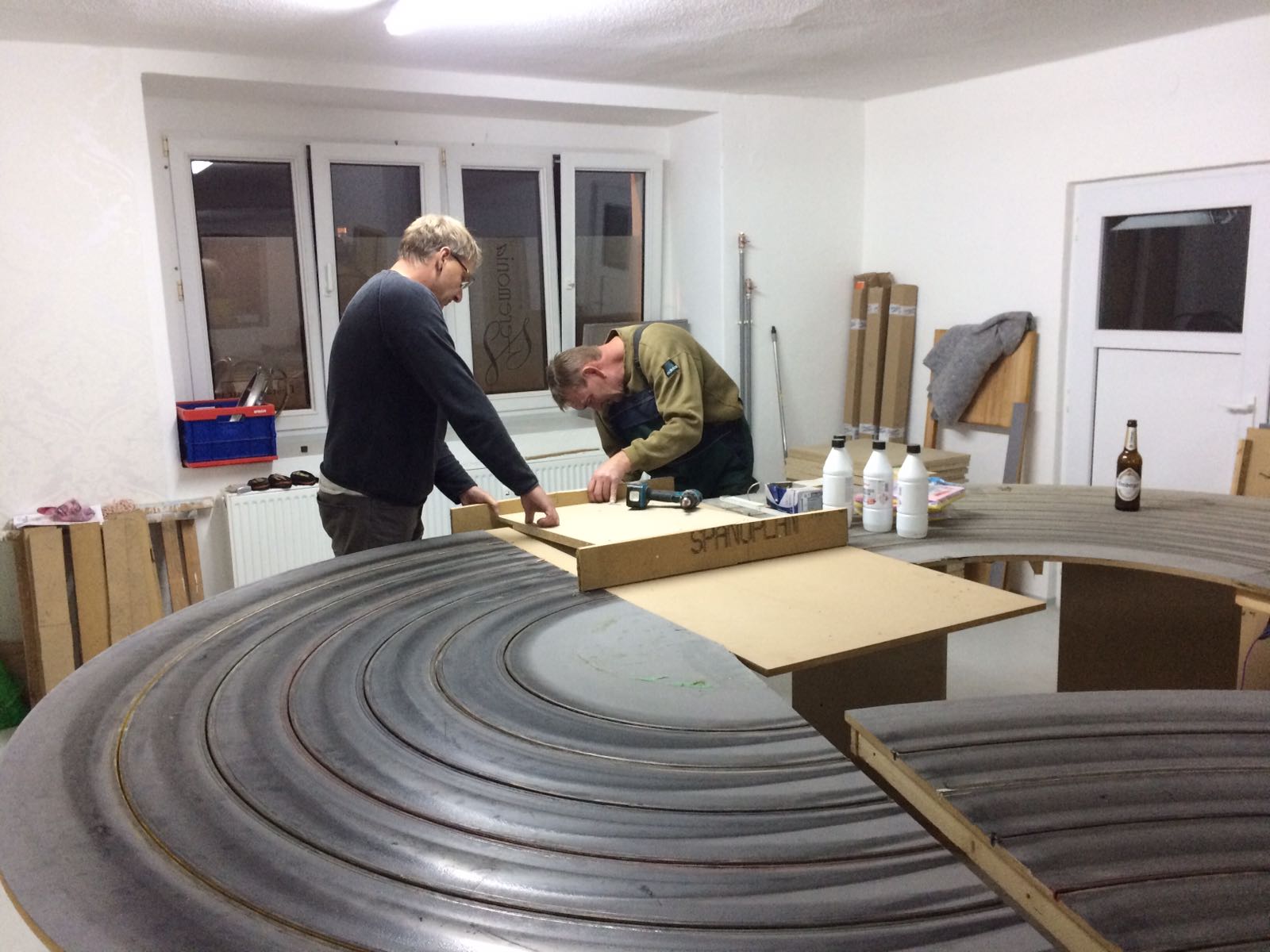 In der ersten Woche waren viele fleißigen Hände am Werke! Die Bahn musste aufgebaut werden, viele Anpassungen waren notwendig bis alles an Ort und Stelle war... Dann stand noch ein großes Vorhaben an: die Bahn musste von den Mosgummistreifen gereinigt werden. Nach Experimenten mit diversen Mittelchen hatten unsere Experten von UZIN das ultimative Vorgehen entwickelt und es ging sichtbar vorwärts! Anbei einmal ein paar Eindrücke mit Steffen und Olli am Werke!