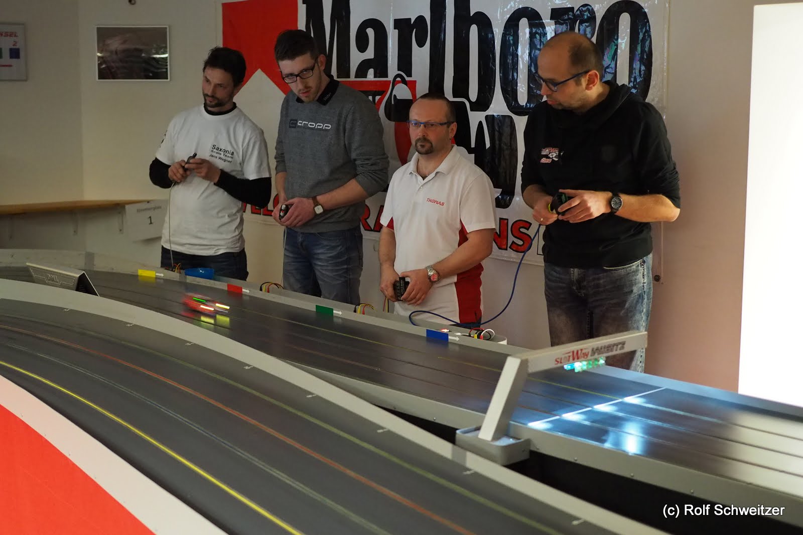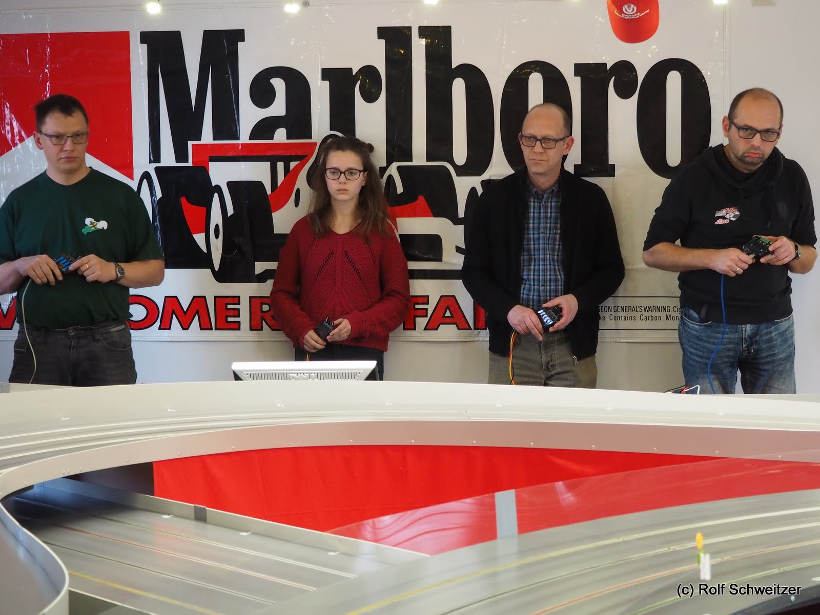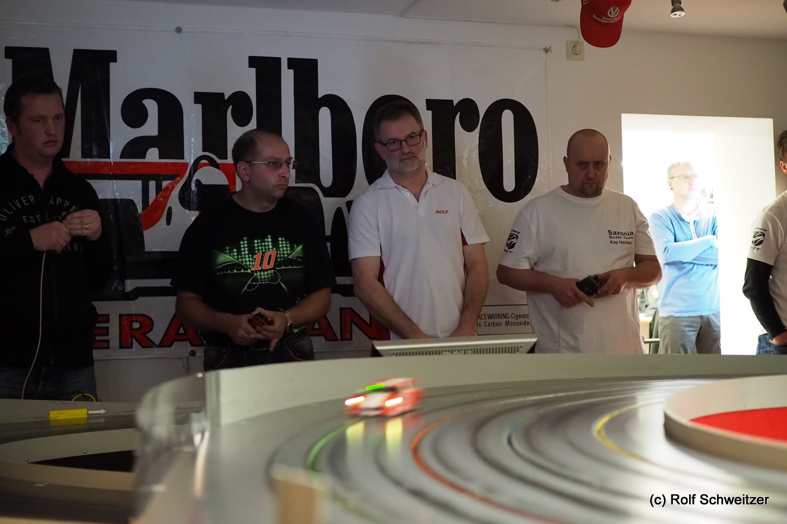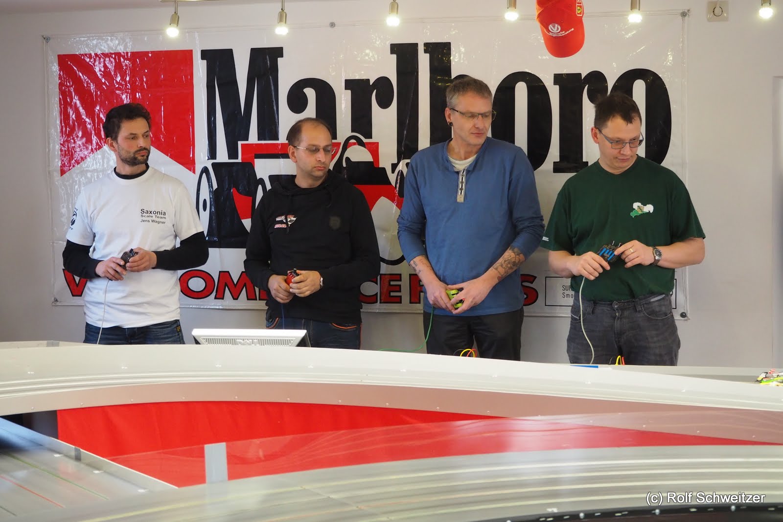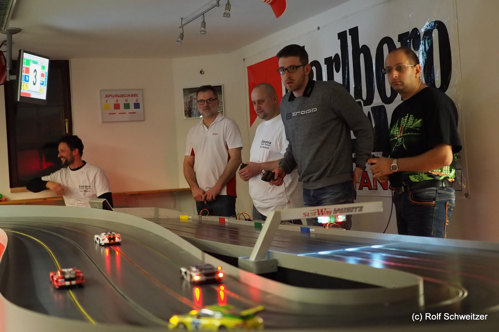 Stefan und ich fuhren in der Quali auf Platz 6 und starteten demnach in der Krabbelgruppe. Durch ganz wenige Abflüge und stabile Zeiten, konnten wir Platz in der Krabbelgruppe hinter den Hausherren, die ebenfalls in der Quali patzten, einfahren. In der ersten Startgruppe waren dann nur die zweiten Hausherren und das Team Saxonia Scaleteam, die Titelverteidiger aus 2016, schneller als wir und Slotway1. Somit kam es zu einem Regrouping. Olli und Frank als Slotracerz1 und Mans-Car-Racing (Falk und Hans-Jörg) stiegen ab. Slotway1 (Jörg und Rolf) und LeMans Slotracerz1 (Stefan und ich) stiegen in die erste Startgruppe auf.
