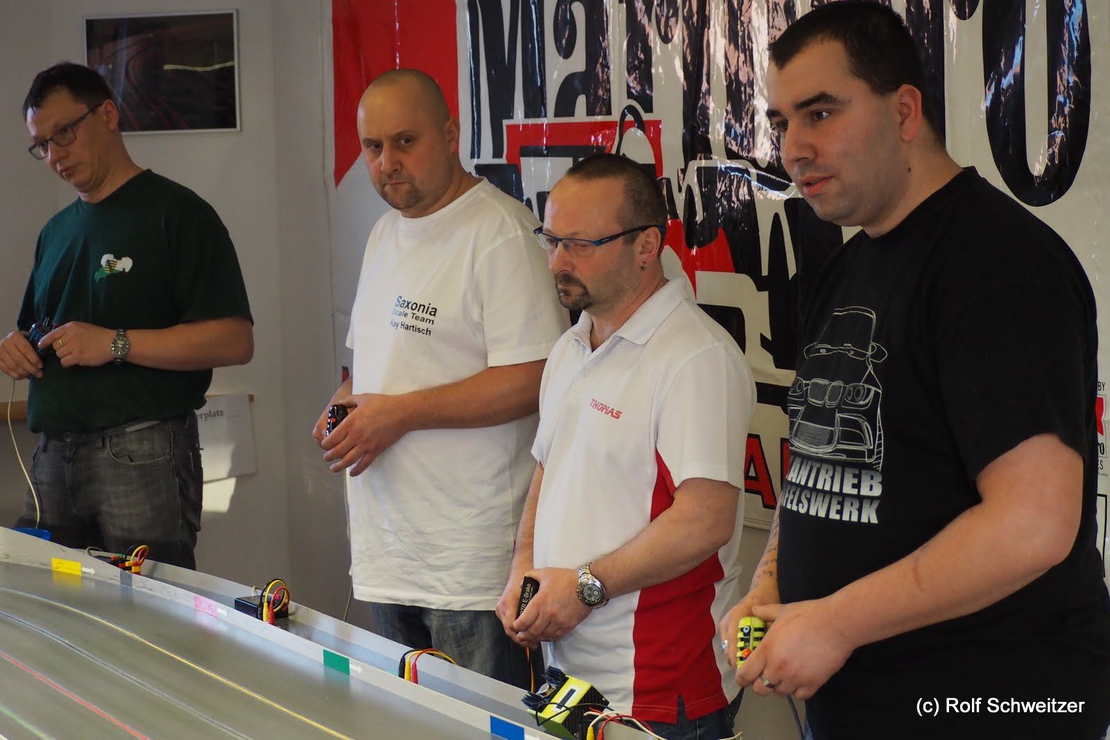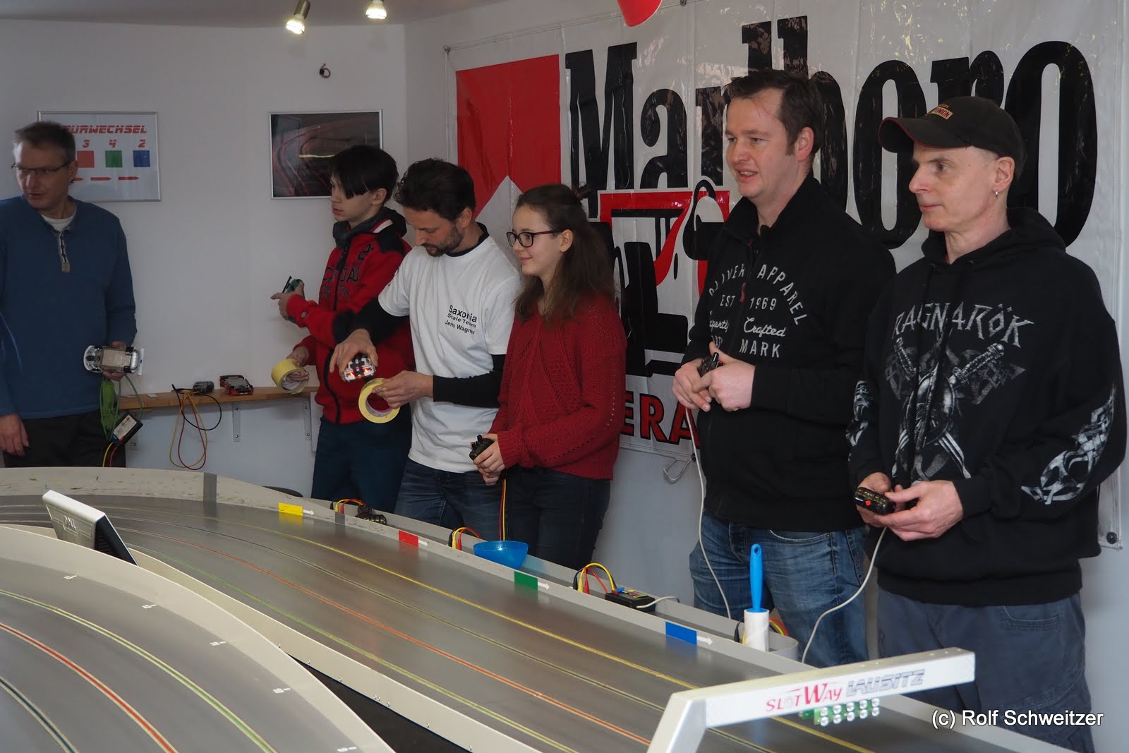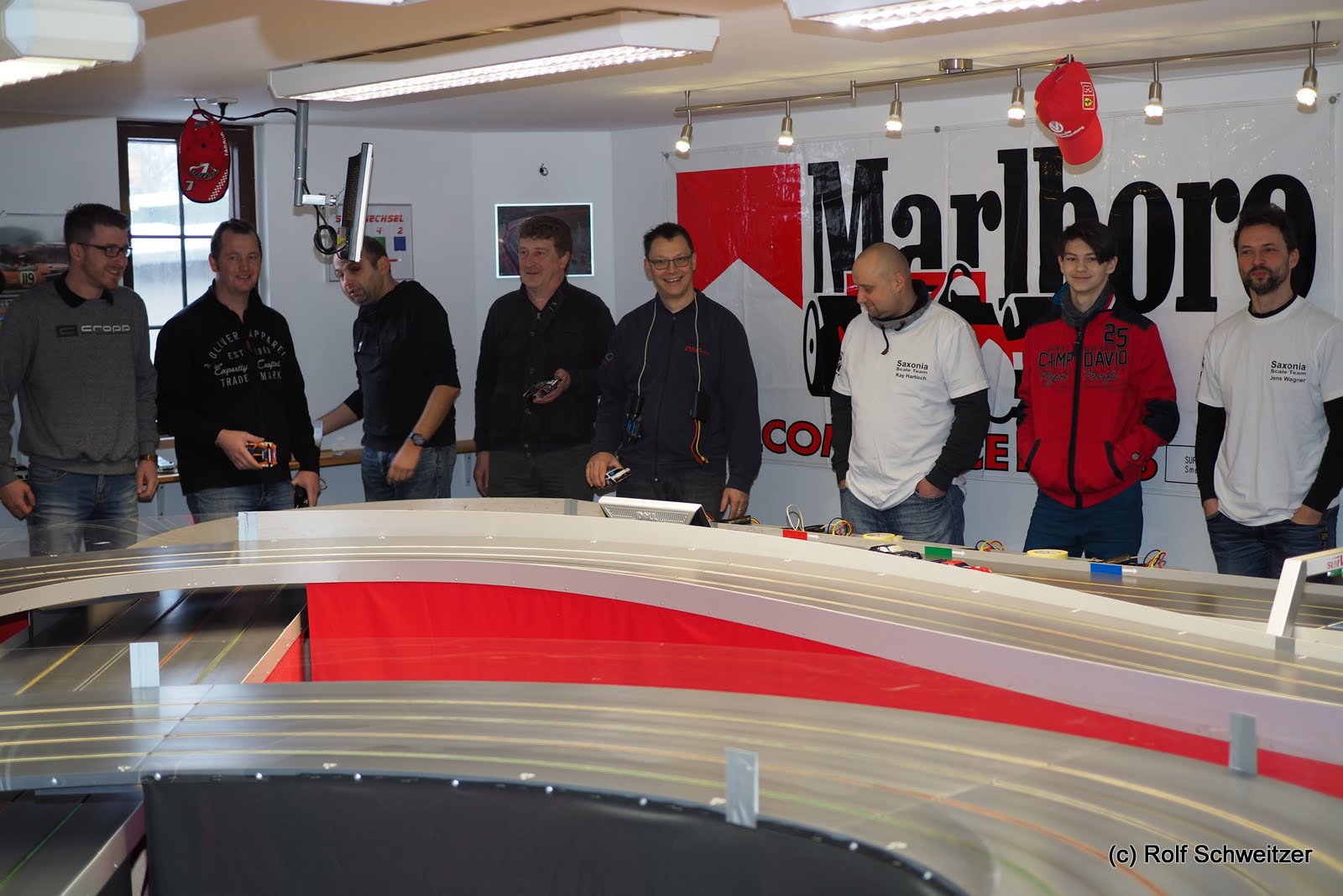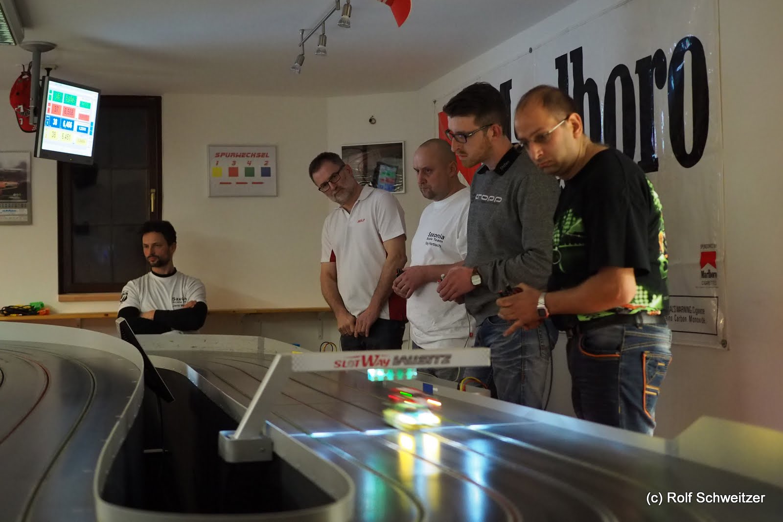 Stefan und ich fuhren in der Quali auf Platz 6 und starteten demnach in der Krabbelgruppe. Durch ganz wenige Abflüge und stabile Zeiten, konnten wir Platz in der Krabbelgruppe hinter den Hausherren, die ebenfalls in der Quali patzten, einfahren. In der ersten Startgruppe waren dann nur die zweiten Hausherren und das Team Saxonia Scaleteam, die Titelverteidiger aus 2016, schneller als wir und Slotway1. Somit kam es zu einem Regrouping. Olli und Frank als Slotracerz1 und Mans-Car-Racing (Falk und Hans-Jörg) stiegen ab. Slotway1 (Jörg und Rolf) und LeMans Slotracerz1 (Stefan und ich) stiegen in die erste Startgruppe auf.
