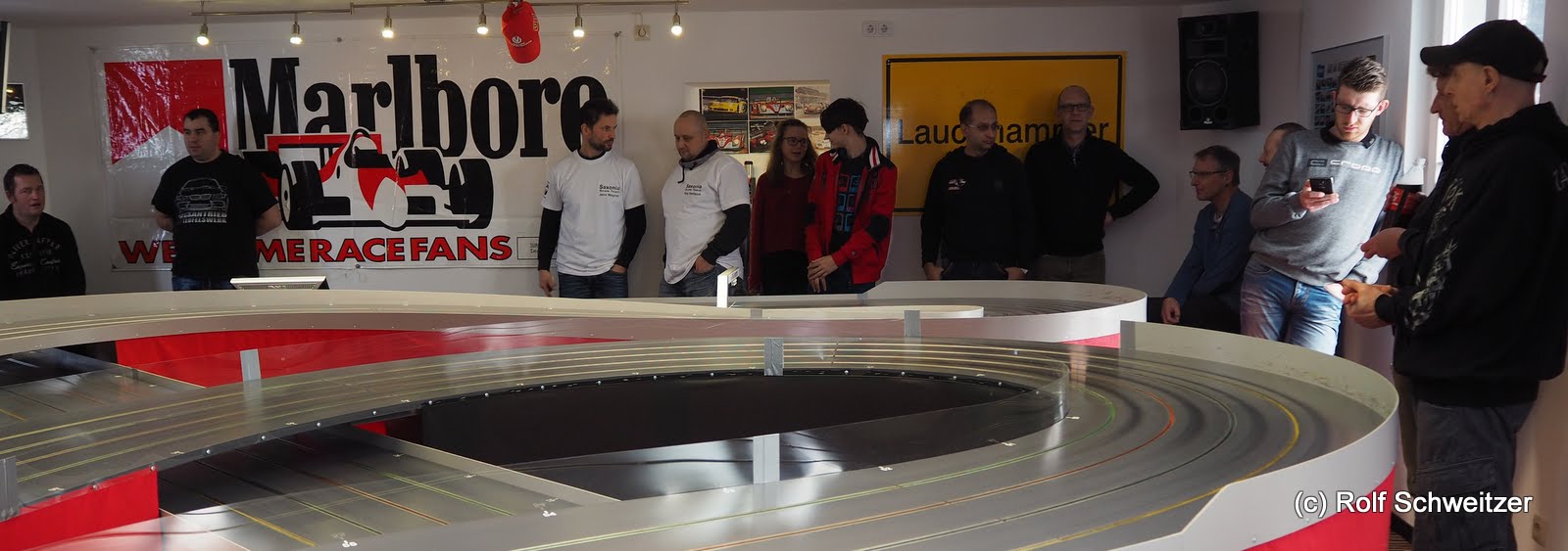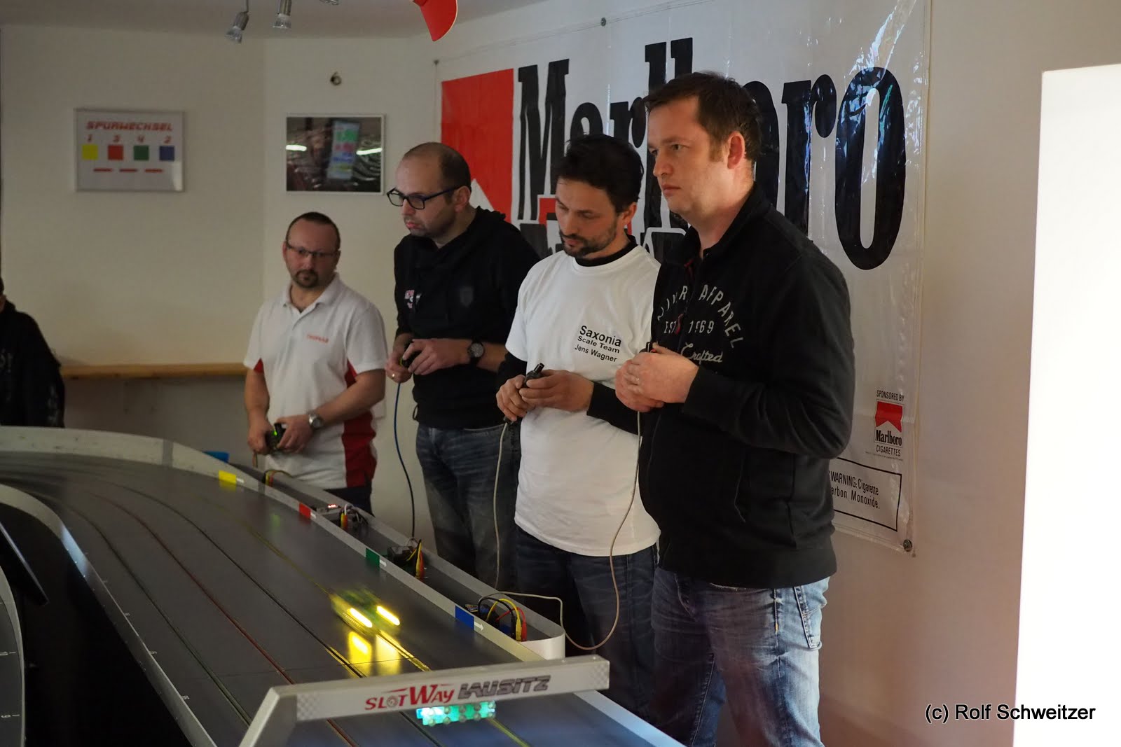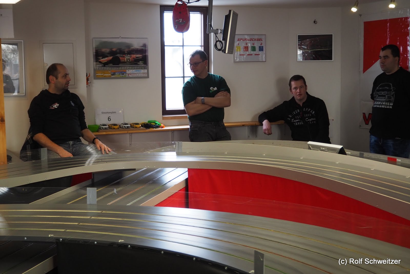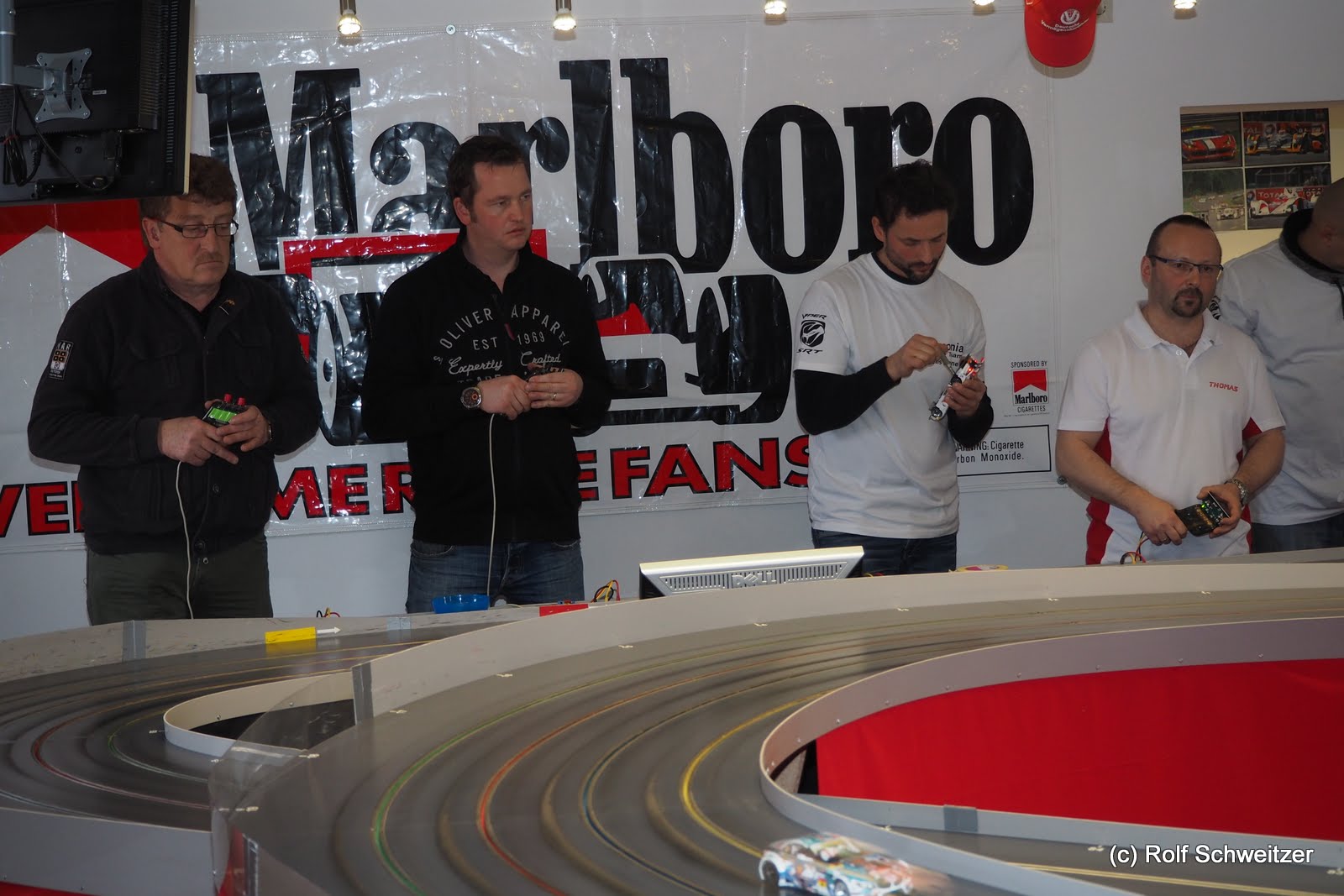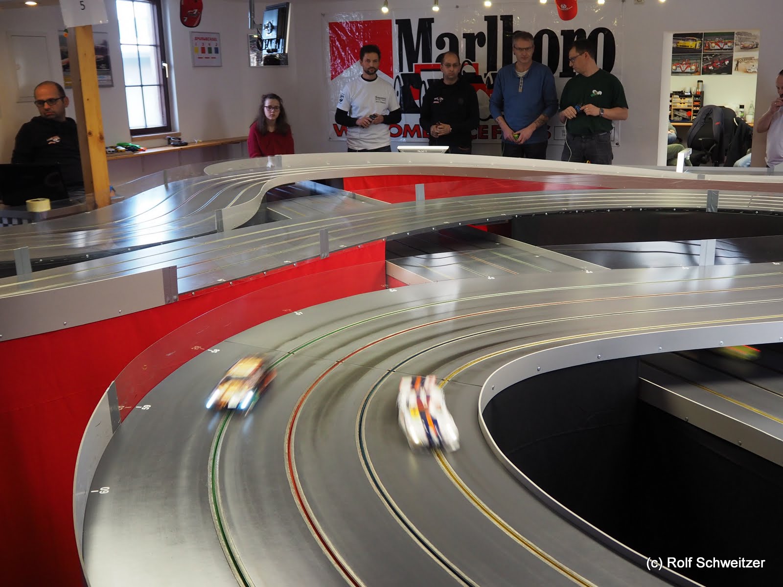Stefan und ich fuhren in der Quali auf Platz 6 und starteten demnach in der Krabbelgruppe. Durch ganz wenige Abflüge und stabile Zeiten, konnten wir Platz in der Krabbelgruppe hinter den Hausherren, die ebenfalls in der Quali patzten, einfahren. In der ersten Startgruppe waren dann nur die zweiten Hausherren und das Team Saxonia Scaleteam, die Titelverteidiger aus 2016, schneller als wir und Slotway1. Somit kam es zu einem Regrouping. Olli und Frank als Slotracerz1 und Mans-Car-Racing (Falk und Hans-Jörg) stiegen ab. Slotway1 (Jörg und Rolf) und LeMans Slotracerz1 (Stefan und ich) stiegen in die erste Startgruppe auf.