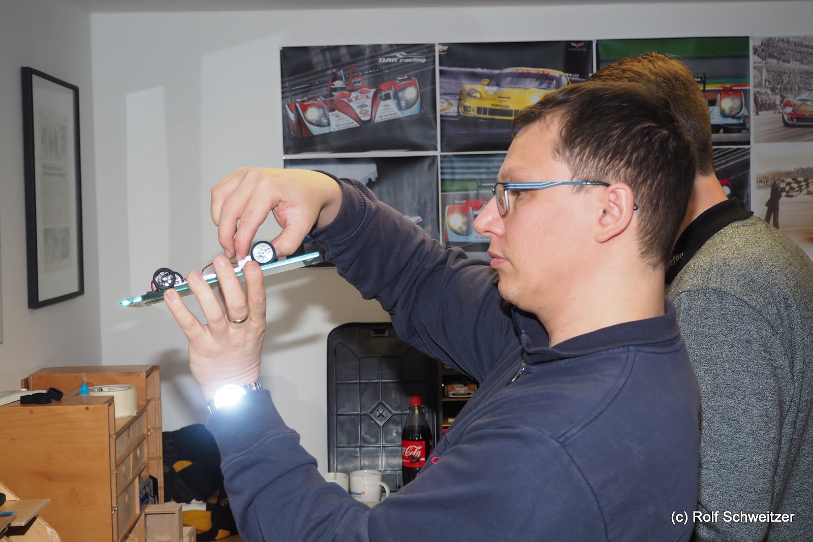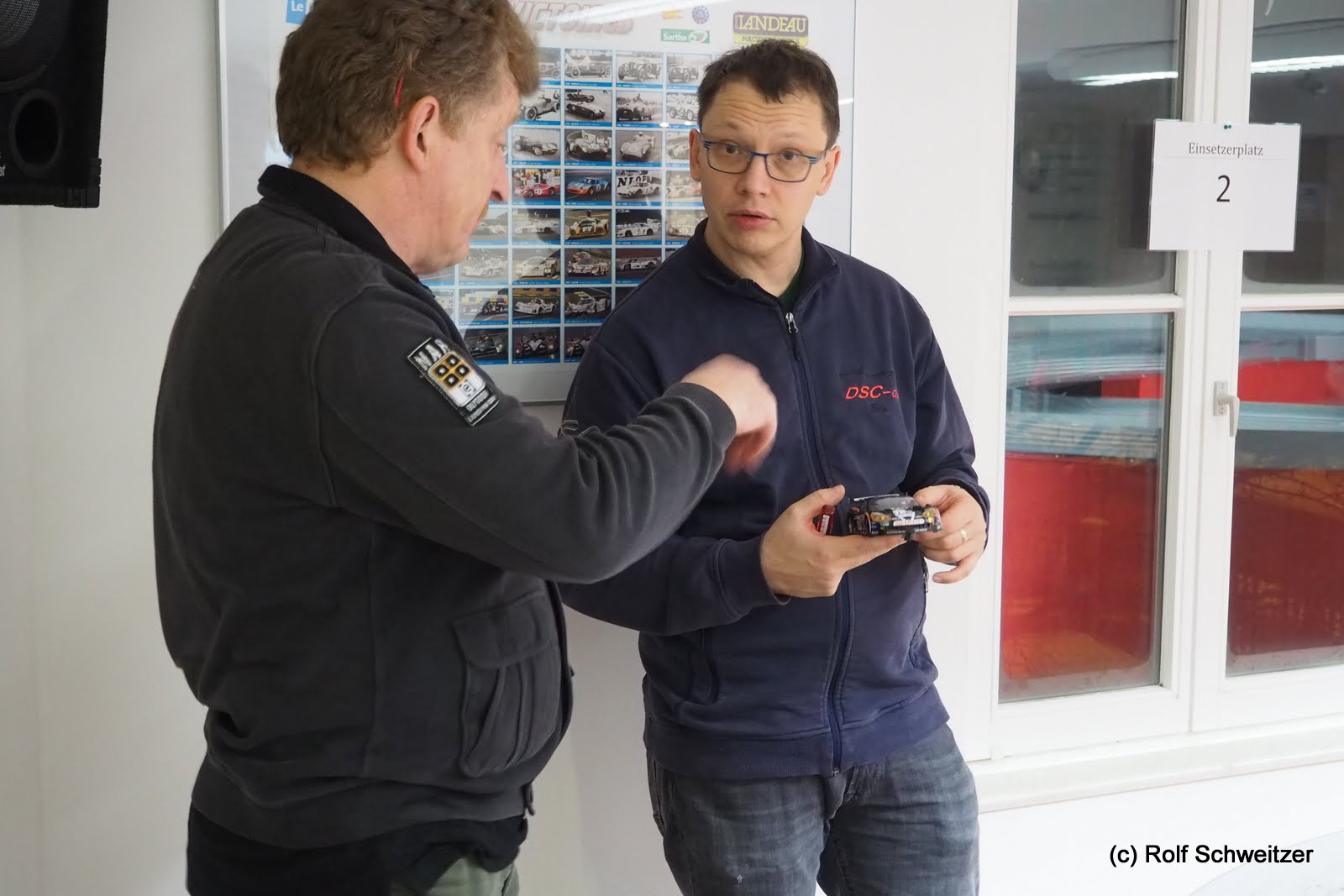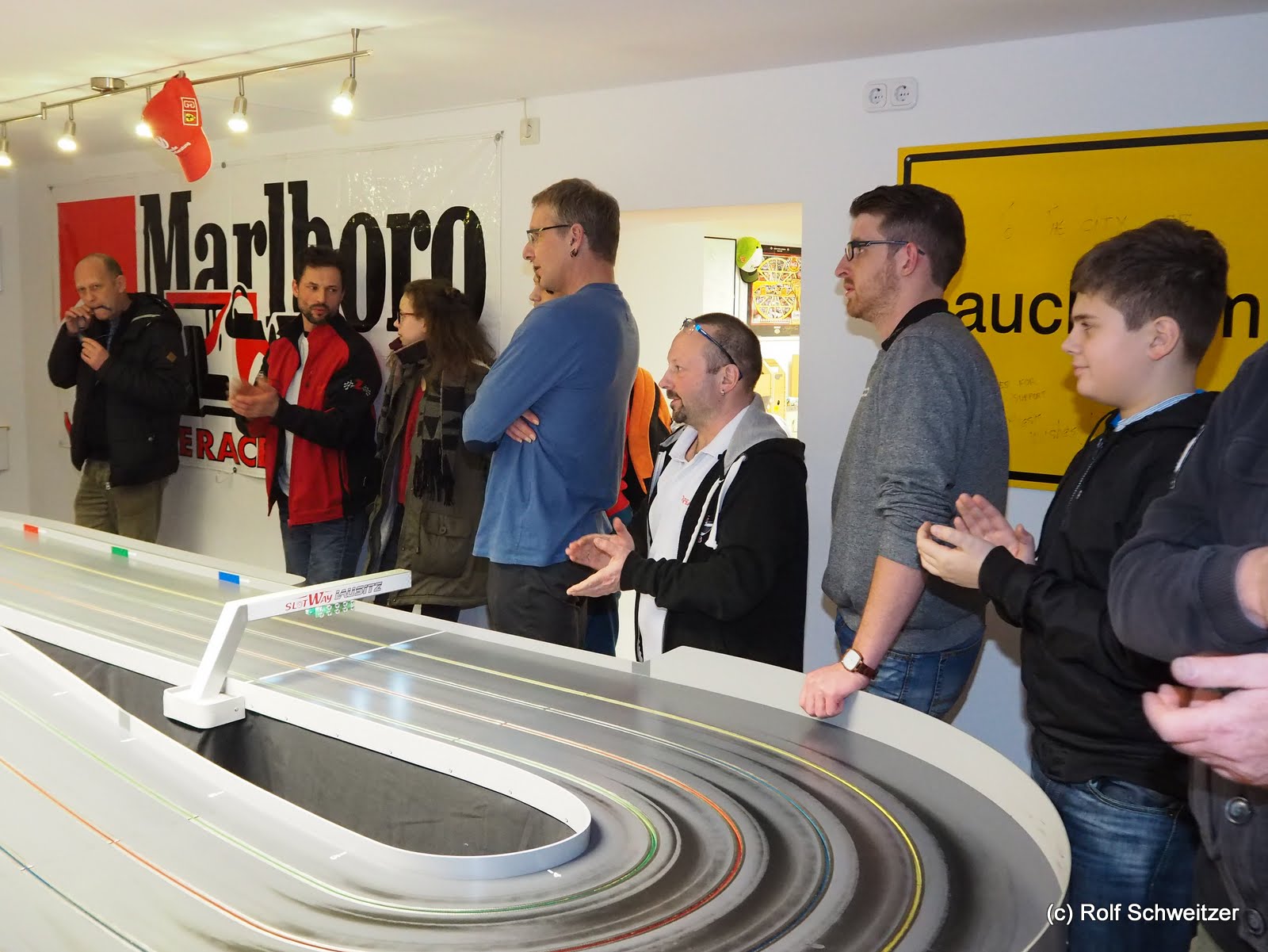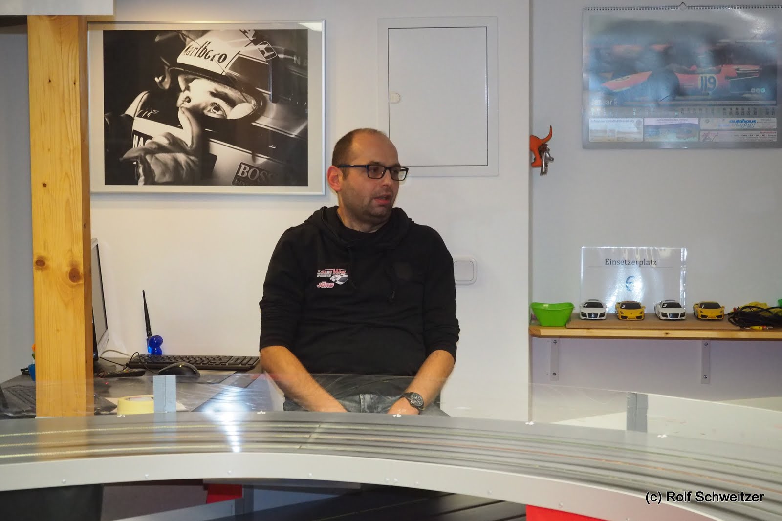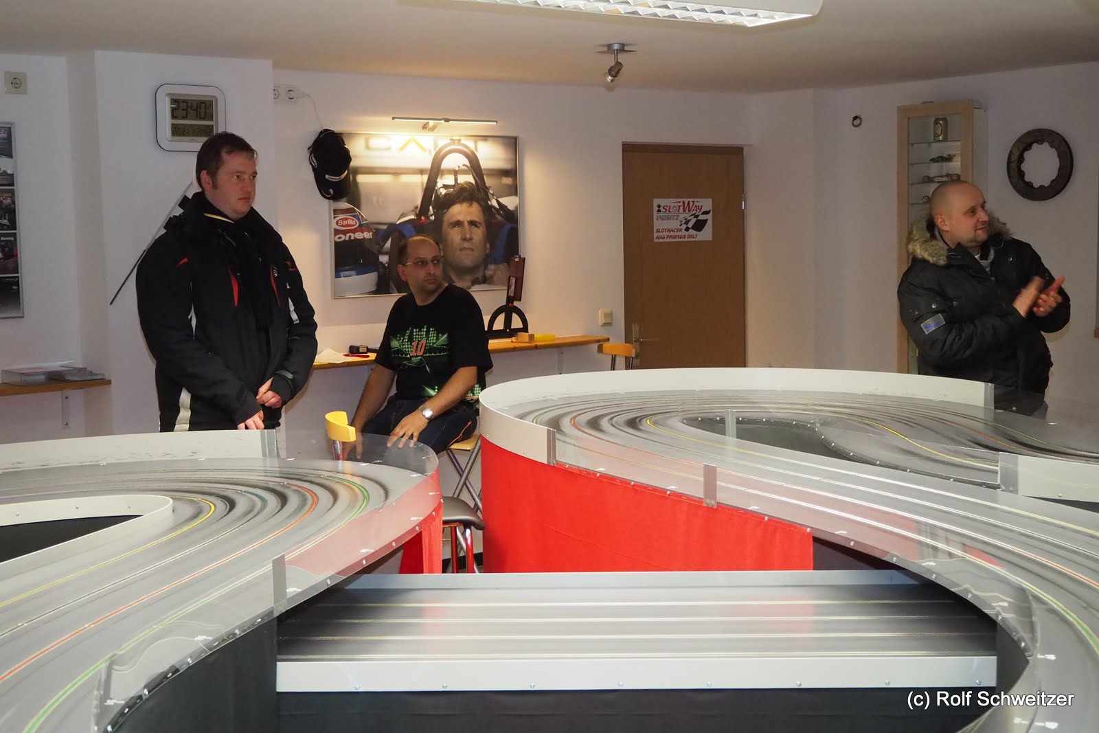 Stefan und ich fuhren in der Quali auf Platz 6 und starteten demnach in der Krabbelgruppe. Durch ganz wenige Abflüge und stabile Zeiten, konnten wir Platz in der Krabbelgruppe hinter den Hausherren, die ebenfalls in der Quali patzten, einfahren. In der ersten Startgruppe waren dann nur die zweiten Hausherren und das Team Saxonia Scaleteam, die Titelverteidiger aus 2016, schneller als wir und Slotway1. Somit kam es zu einem Regrouping. Olli und Frank als Slotracerz1 und Mans-Car-Racing (Falk und Hans-Jörg) stiegen ab. Slotway1 (Jörg und Rolf) und LeMans Slotracerz1 (Stefan und ich) stiegen in die erste Startgruppe auf.