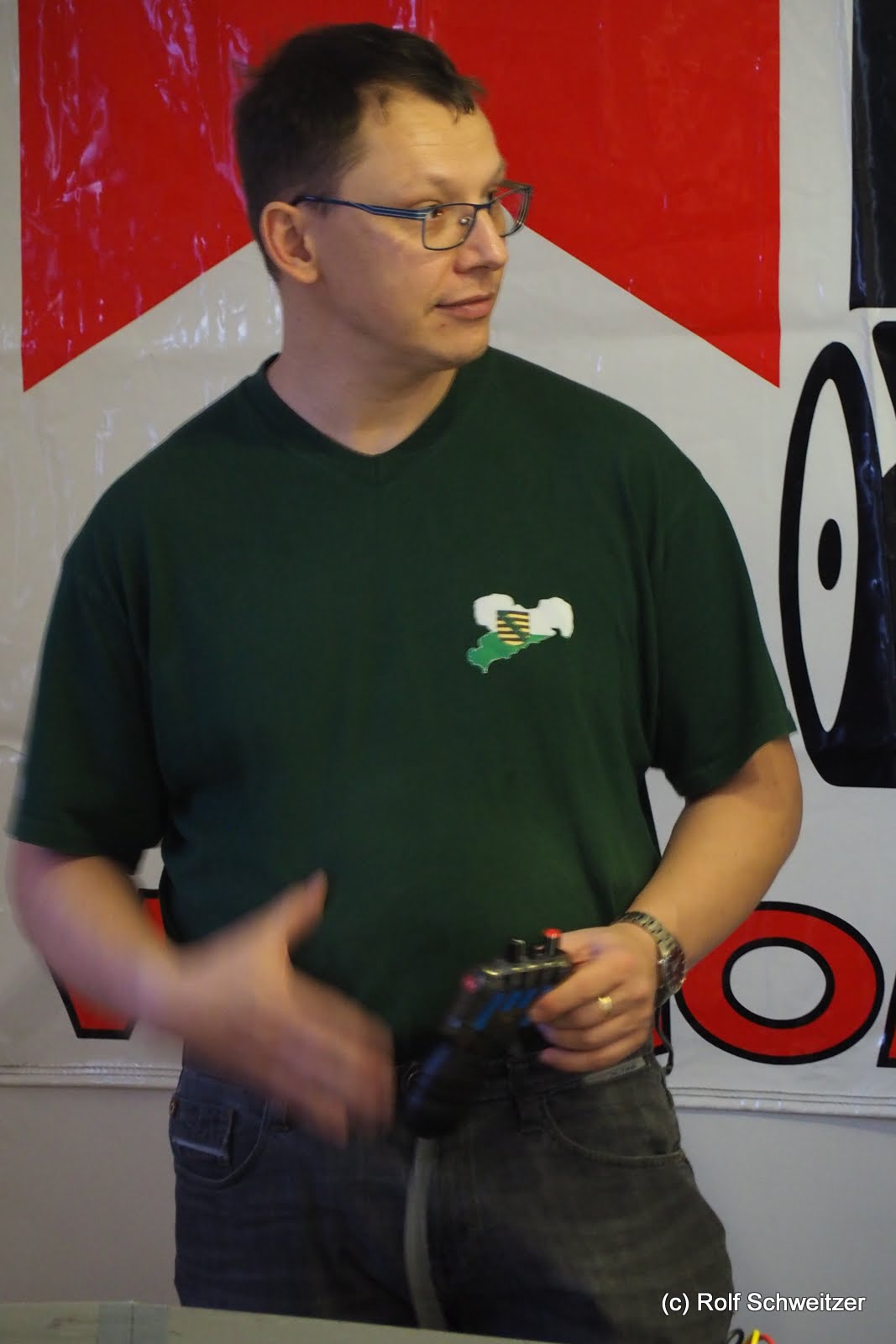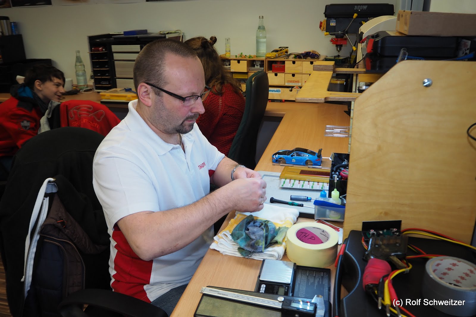 Sicher wollten Olli und ich mit unseren jeweiligen Teamkollegen oben angreifen. Wir mussten aber dem fahrerischen Können der Hausherren und auch Jens, mit Ihren perfekt abgestimmten Fahrzeugen, Tribut zollen. Warum es dazu kam, möchte ich kurz schildern. Olli und ich haben in den vergangenen Monaten jeweils ca. 200 Arbeitsstunden an Freizeit in die Bahn in Dohna gesteckt, damit diese pünktlich im März unter Strom steht. Damit das große Projekt "Nachwuchsgewinnung" endlich starten kann. Somit bliebt keine bzw. nur sehr sehr wenig Zeit ein Auto perfekt zu bauen, auf die Bahn in Lauchhammer abzustimmen und vor allem zu trainieren, zu trainieren und nachmals zu trainieren. Die Prioritäten haben sich eben in den letzten Tagen, Wochen und Monaten etwas verschoben, denn das unsere Bahn in Dohna endlich fertig wird, liegt Olli und mir sehr am Herzen.