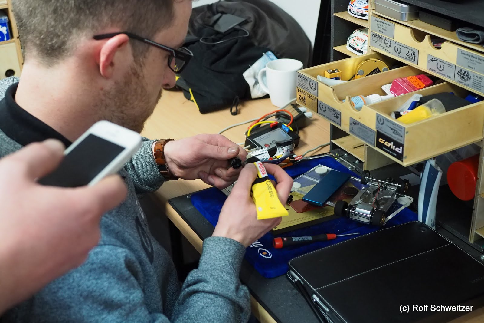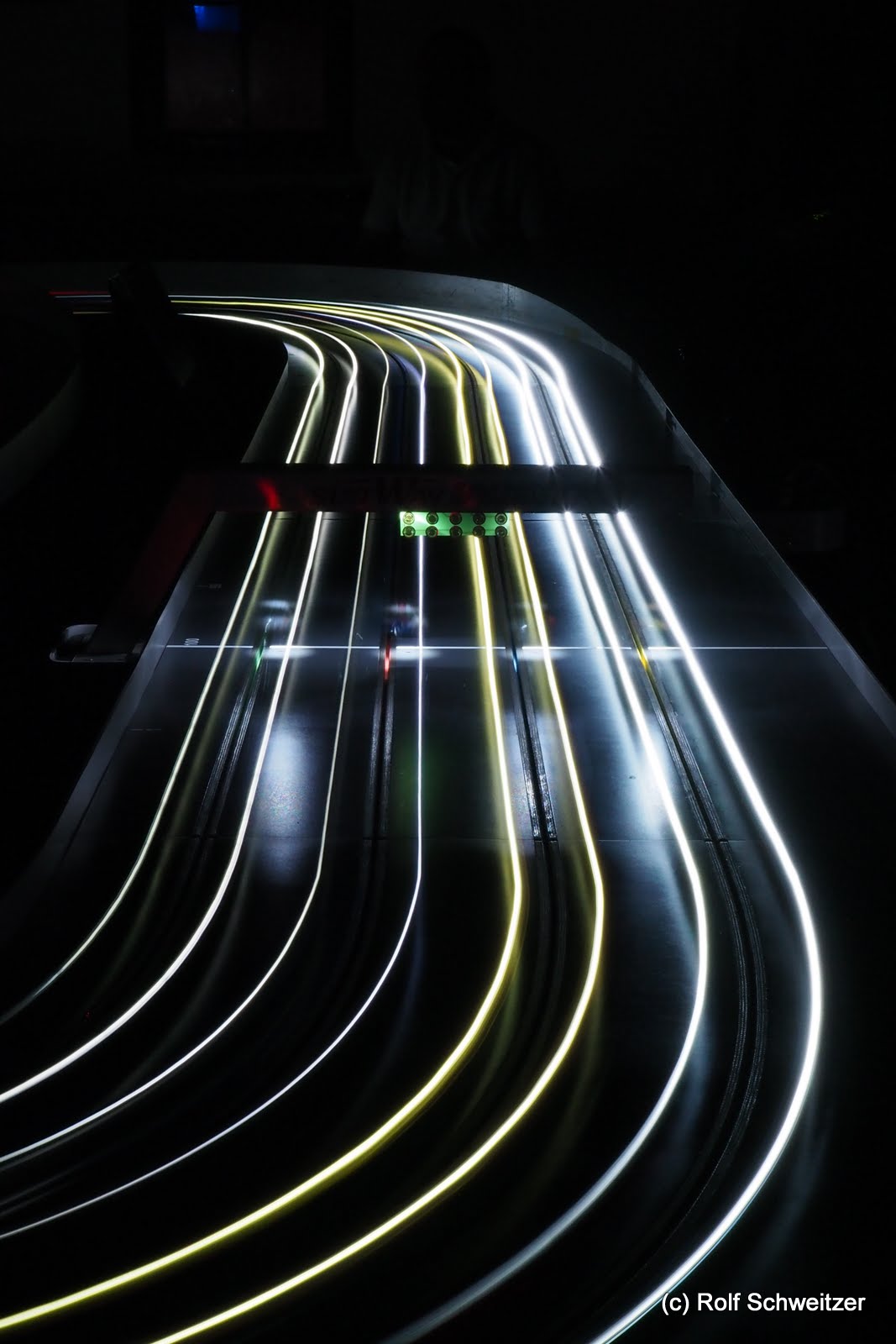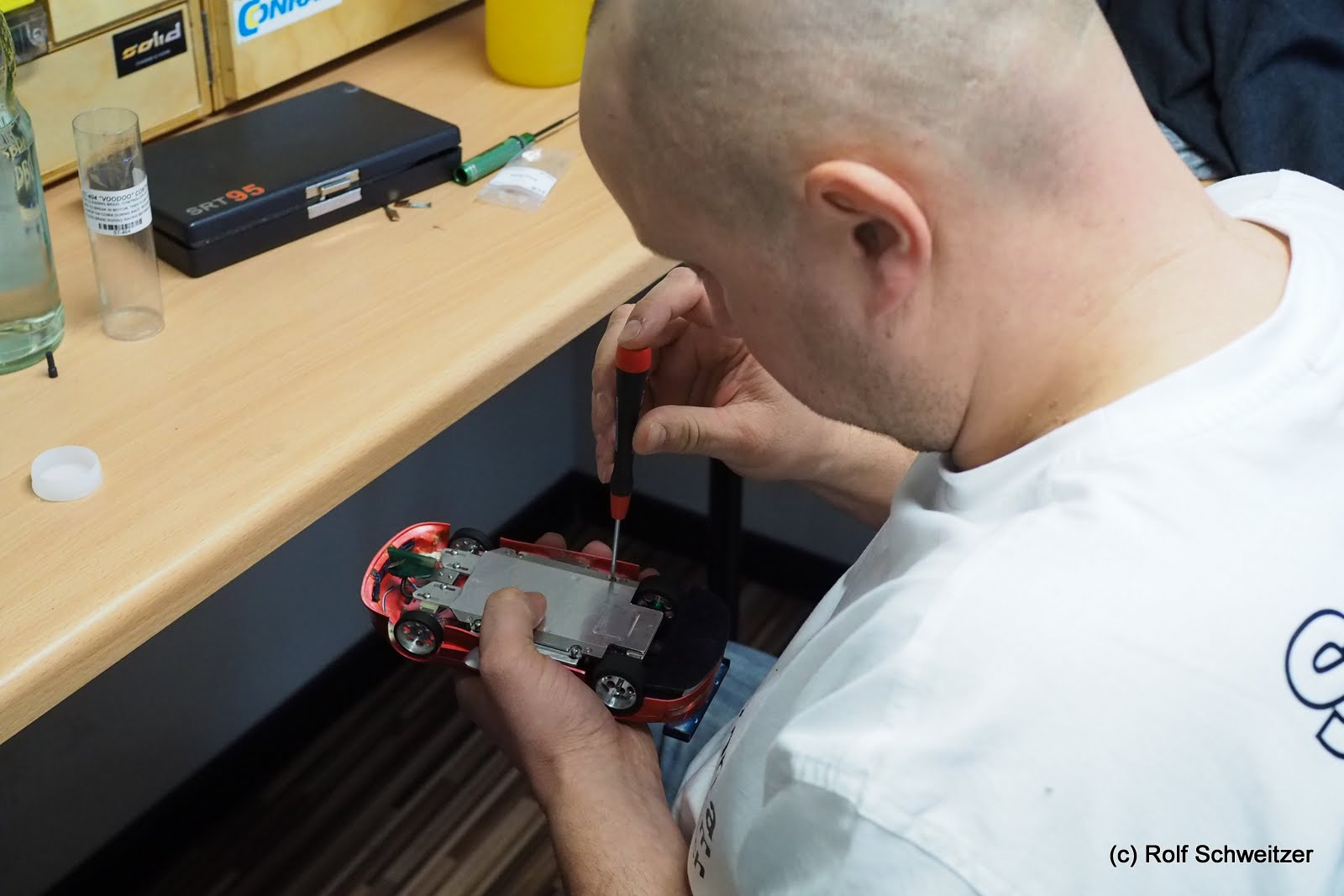 Jetzt hieß es für Stefan und mich nur noch den 4. Platz halten und mit einem 2/10 - 3/10 langsameren Auto oder Fahrstil, so genau kann man das jetzt nicht sagen (aber wahrscheinlich letzteres, weil uns eben die Bahn nicht liegt), so wenig wie möglich abzufliegen. Unsere Schlange sanft um die Kurven tragen und die Rundenzeiten dabei möglichst stabil zu halten. Einen kurzen Aufreger hatten wir im 2. Turn vom 2. Lauf. Da viel plötzlich unser Licht am Fahrzeug aus. Wir hofften nur, dass sich kein Kabel verklemmt und uns noch zu einer Reparaturpause unter Strom zwingt. Das Fahrzeug hielt und wir konnten dann in der Reparaturpause vor dem Nachtlauf unser Licht reparieren.
