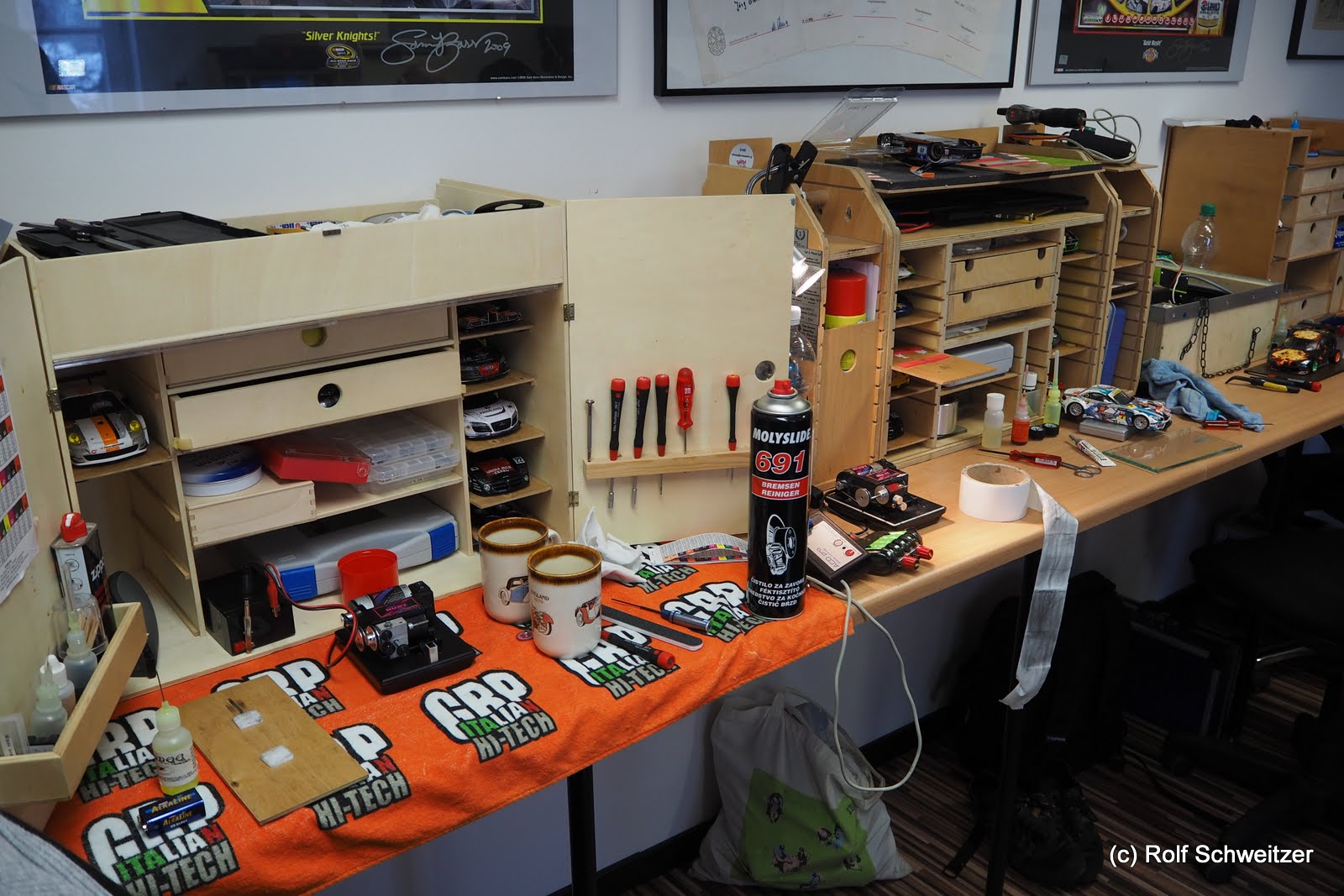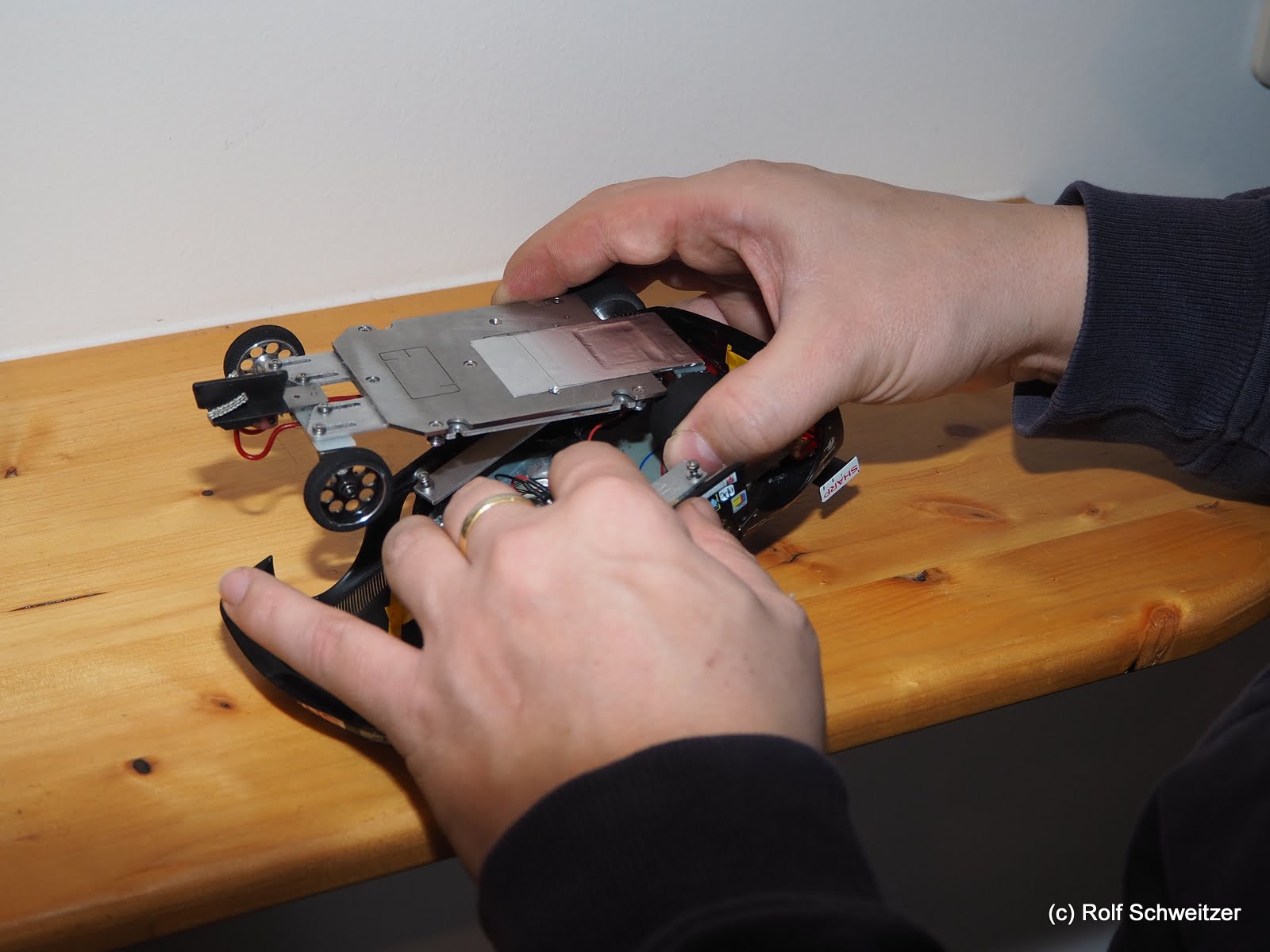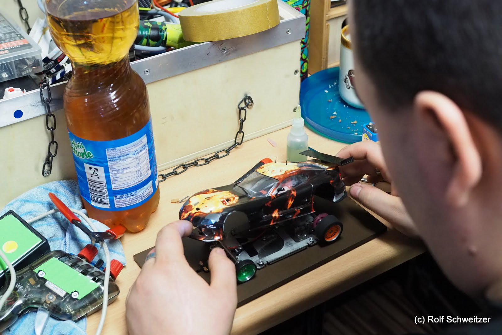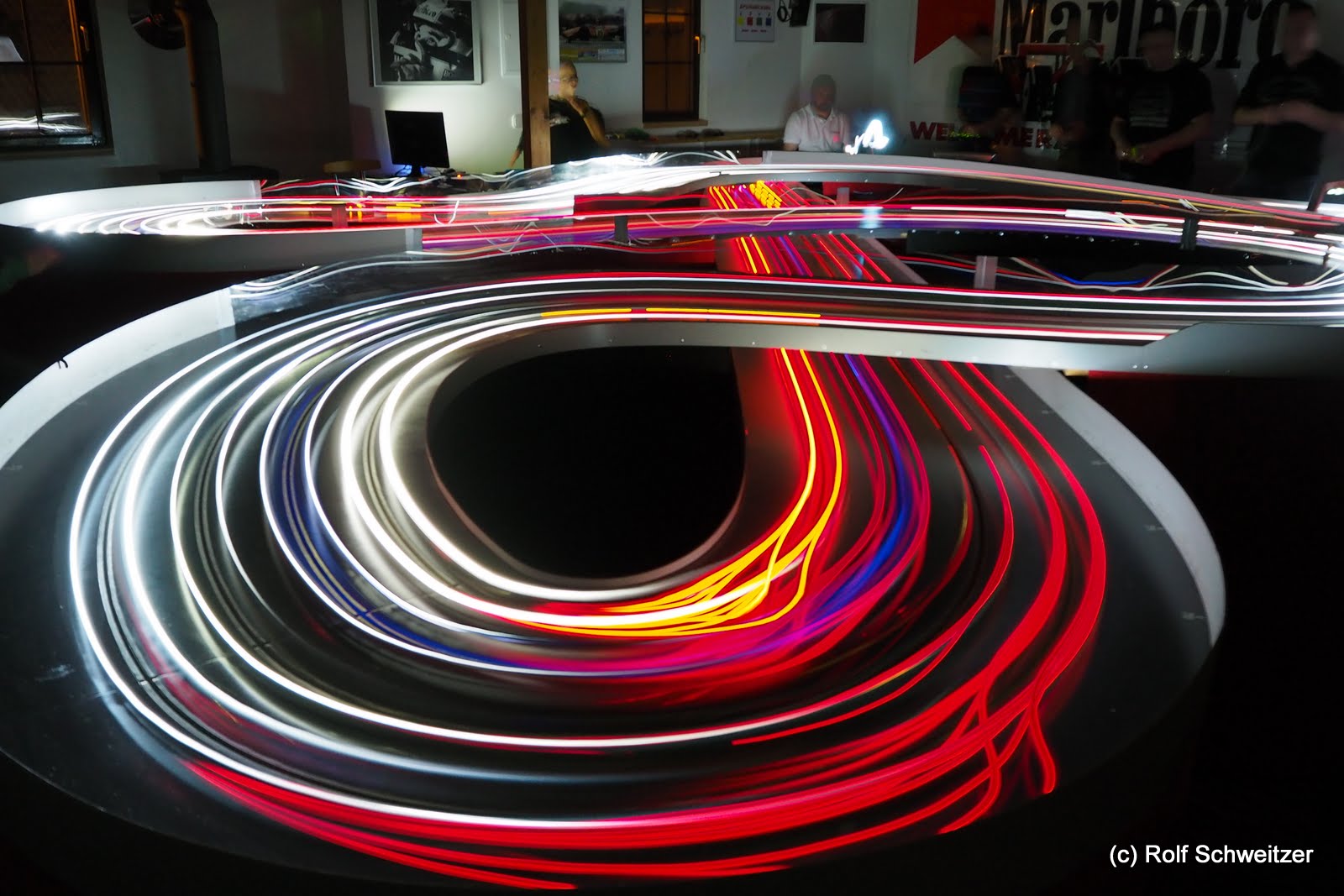 Jetzt hieß es für Stefan und mich nur noch den 4. Platz halten und mit einem 2/10 - 3/10 langsameren Auto oder Fahrstil, so genau kann man das jetzt nicht sagen (aber wahrscheinlich letzteres, weil uns eben die Bahn nicht liegt), so wenig wie möglich abzufliegen. Unsere Schlange sanft um die Kurven tragen und die Rundenzeiten dabei möglichst stabil zu halten. Einen kurzen Aufreger hatten wir im 2. Turn vom 2. Lauf. Da viel plötzlich unser Licht am Fahrzeug aus. Wir hofften nur, dass sich kein Kabel verklemmt und uns noch zu einer Reparaturpause unter Strom zwingt. Das Fahrzeug hielt und wir konnten dann in der Reparaturpause vor dem Nachtlauf unser Licht reparieren.